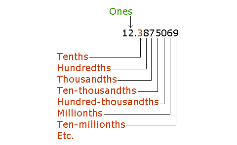 | 412.387056 The decimal point signifies "and," in the sense of "plus." That is the whole number 412 plus 3 tenths of 1, plus 8 hundredths of 1, plus 7 thousandths; and so on. Any number written with a decimal point is loosely called a decimal. A number less than 1 -- a proper fraction -- written as a decimal, we call a decimal fraction. A number written with a numerator and denominator we call a common fraction (Lesson 20). The positions to the right of the decimal point are called the decimal 412.387056 places; the 1st, the 2nd, the 3rd, and so on. Each decimal digit occupies a decimal place. | | The digit at the 1st decimal place shows the number of Tenths. In the number above, there are 3 tenths. The 2nd decimal place shows the number of Hundredths. In that number, there are 8 hundredths. And so on. The first digit to the left of the decimal point -- the 2 -- shows the number of Ones. As with whole numbers, each digit has its place value: 2.3875. . . Ones, tenths, hundredths, thousandths, ten-thousandths, . . . As with the whole numbers, each place is ten times the place to its right. One is ten tenths. One-tenth is ten hundredths. One-hundredth is ten thousandths. One-thousandth is ten ten-thousandths. And so on. Example 1. In this number 534.267 a) there are how many ones? Answer. 4. The ones place is the first digit to the left of the decimal point. b) How many hundredths? Answer. 6. Hundredths (ordinal) is a decimal unit. It falls to the right of the decimal point. c) How many hundreds? Answer. 5. Hundred (cardinal) is a whole unit. It falls to the left of the decimal point. Example 2. Expanded form. Just as the numeral for every whole number stands for a sum (Lesson 2), so does the numeral for every decimal. Here is the expanded form of 534.267. 534.267 = 5 Hundreds + 3 Tens + 4 Ones + 2 Tenths + 6 Hundredths + 7 Thousandths.